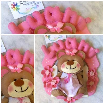 Lindíssima guirlanda feita em MDF e feltro de uma mimosa ursinha rodeada por flores, sentada numa cerquinha branca! Delicadeza sem igual, perfeito para porta de maternidade!